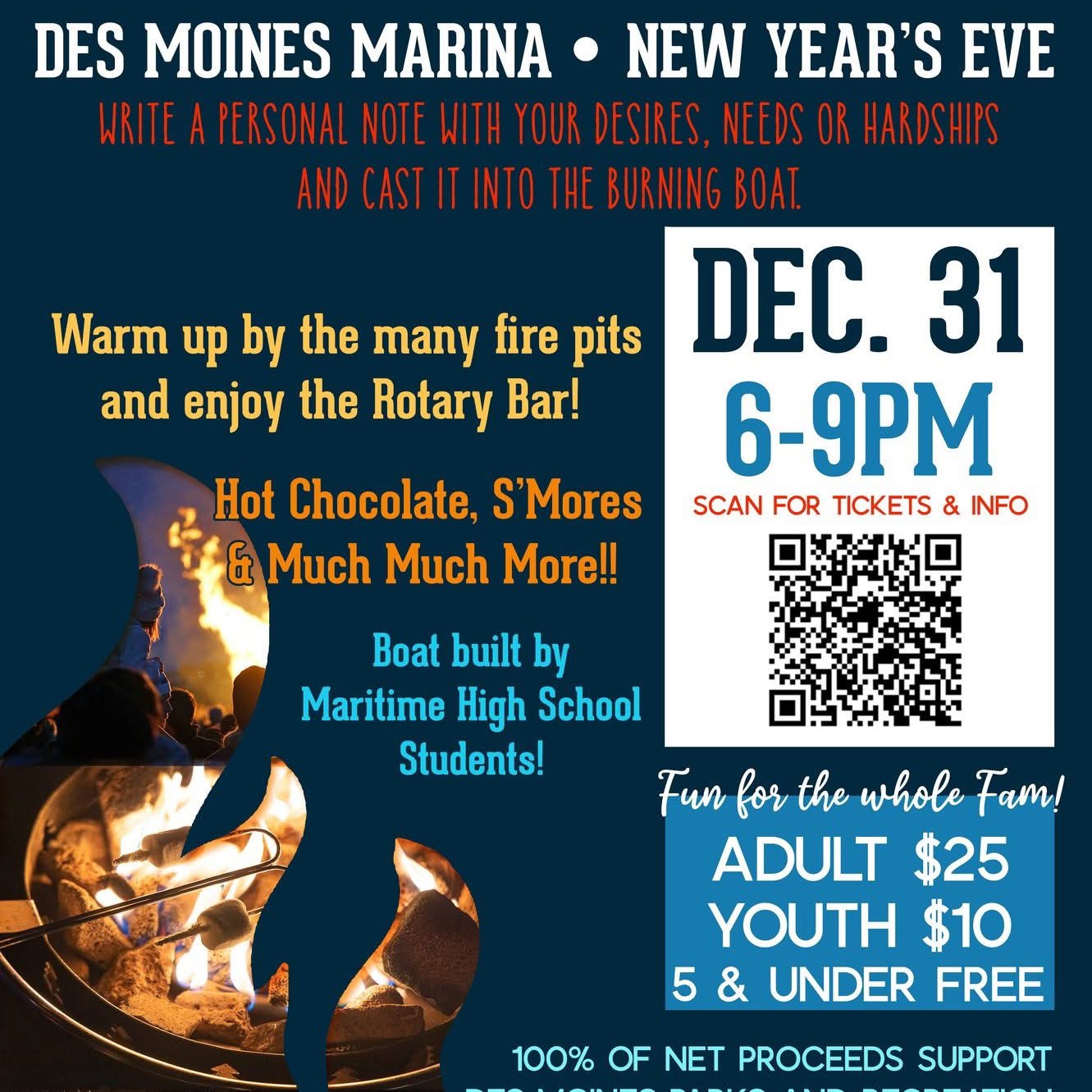 The 2025 Burning Boat Festival will light up the Des Moines Beach Park with a community bonfire on New Year’s Eve. Join us as we All are invited.